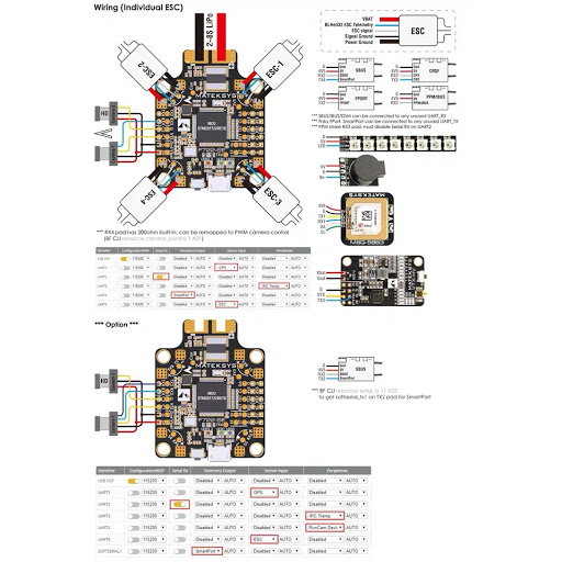 FC Specifications MCU: 216MHz STM32F722RET6 IMU: MPU6000 & ICM20602, Dual Gyros built-in (SPI) Baro: BMP280 (I2C) OSD: AT7456E (SPI) Blackbox: MicroSD card slot (SPI) 5x Uarts (1,2,3,4,6) with build-in inversion 1x Softserial supported 8x Dshot/Proshot/oneshot outputs 1x I2C 4x RX6 pad(one per cornet) for BLheli32 ESC telemetry 4x individual ESC power/signal pads 1x Group of G/S1/S2/S3/S4 pads for 4in1 ESC Signal/GND 3x LEDs for FC STATUS (Blue, Green) and 3.3V indicator(Red) Vbat filtered output power for VTX, Switchable via AUX (modes tab-user1) Dual Camera image switchable via AUX (modes tab-user2) Camera control: Yes Smartaudio & Tramp VTX protocol: Yes WS2812 Led Strip : Yes Beeper : Yes RSSI: Yes Additional ADC for INAV analog airspeed PDB Specifications Input: 6~36V (3~8S LiPo) w/TVS protection PDB: 4x35A (Max.4x46A) BEC: 5V 2A cont. (Max.3A) LDO 3.3V: Max.200mA Current Sensor 184A (Scale 179) Battery Voltage Sensor: 1:10 (Scale 110) FC Firmware BetaFlight / INAV Target: MATEKF722SE Physical Mounting: 30.5 x 30.5mm, Φ4mm with Grommets Φ3mm Dimensions: 36 x 46 mm Weight: 10g Including 1x FC F722-SE 6x silicon grommets M4 to M3 1x FR4 PCB Plate 36*36*1mm 1x Rubycon ZLH 35V/470uF (Low ESR)